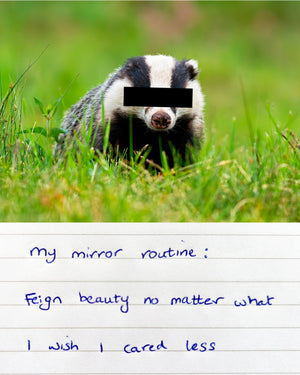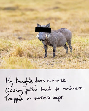 This series of 42 artworks pairs surreal animal photographs, each with censored eyes - with deeply personal haiku confessions, creating a striking interplay between absurdity and authenticity. Whilst some confessions are fleeting observations, others reveal profound anxieties or unspoken truths.