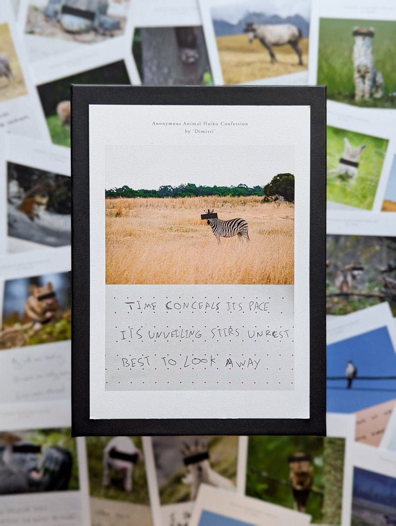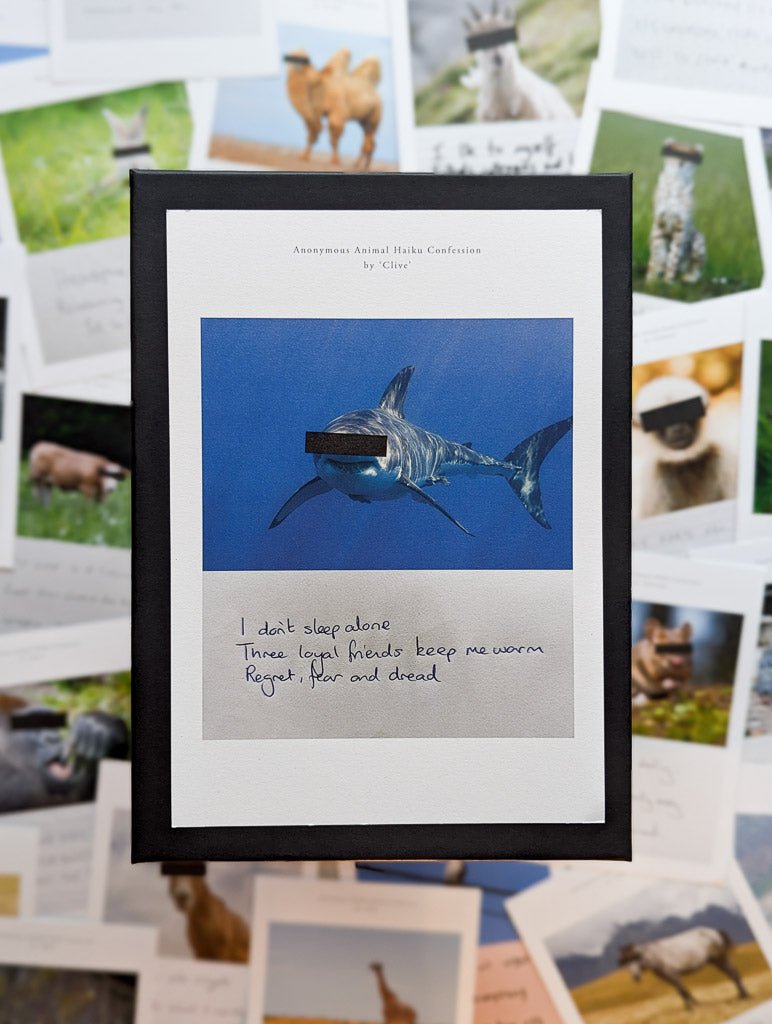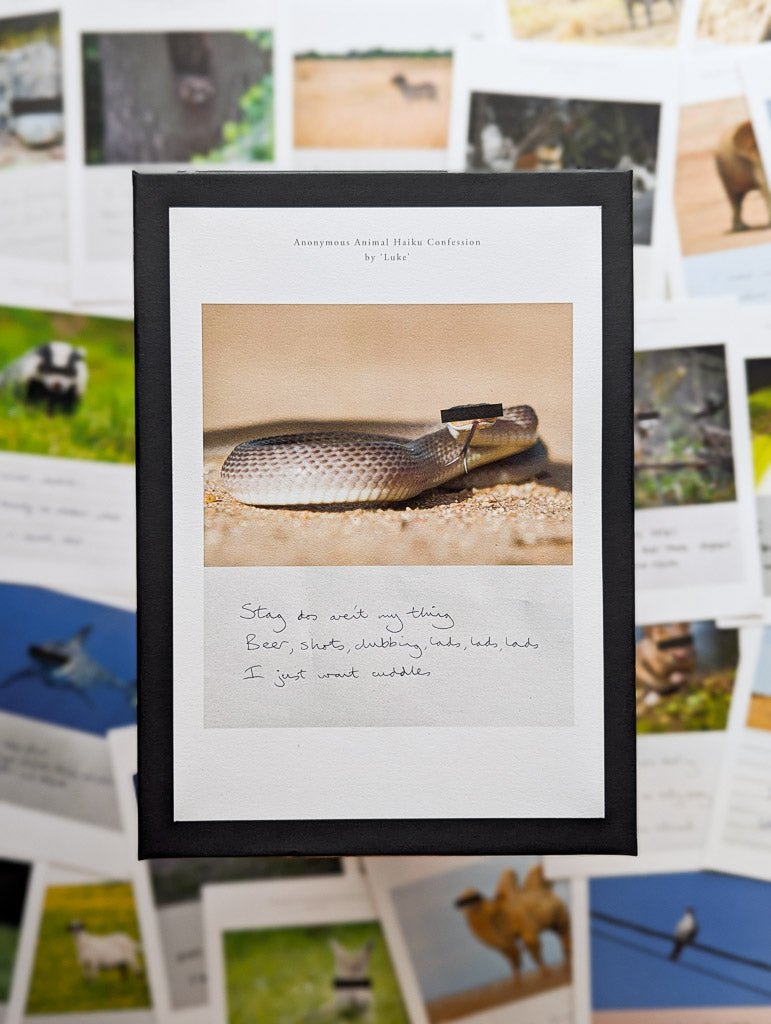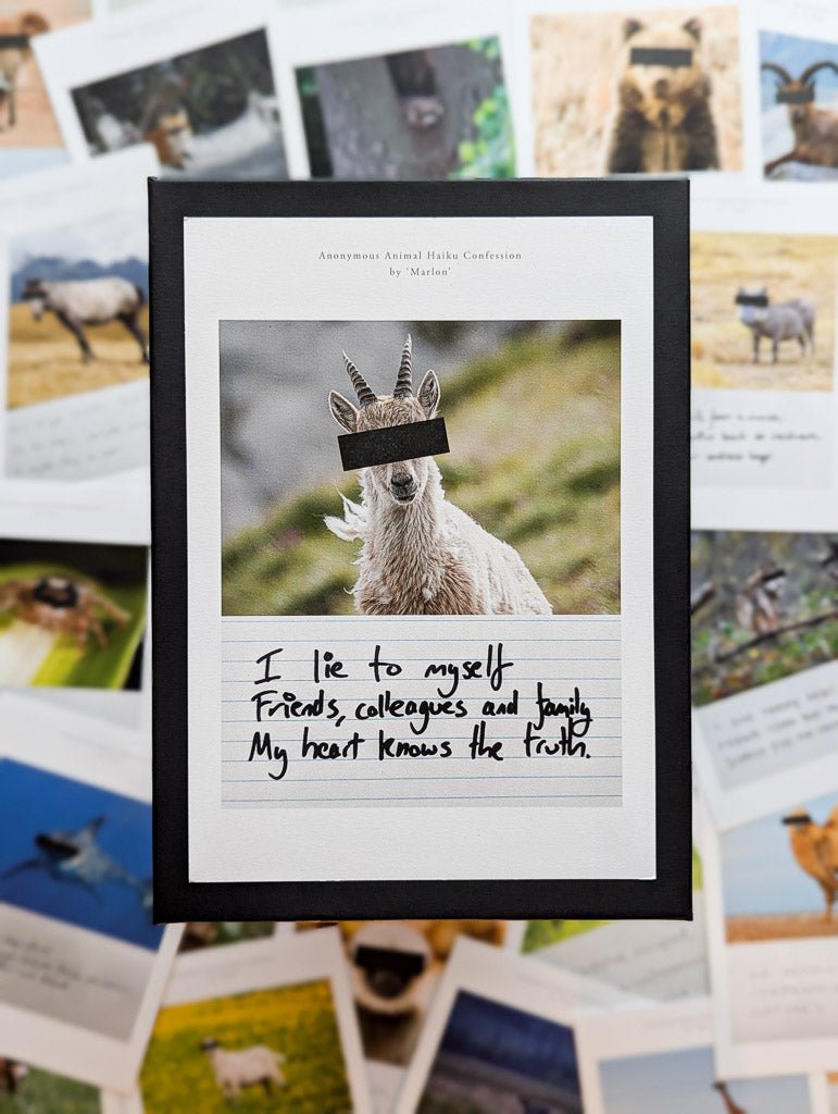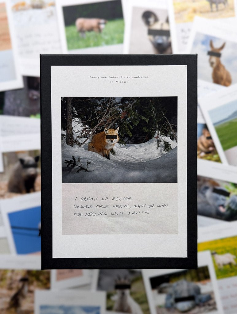 A confession box containing 42 artworks from the Anonymous Animal Haiku Confessions series. Each artwork pairs a surreal animal photograph with censored eyes and an anonymous haiku confession.