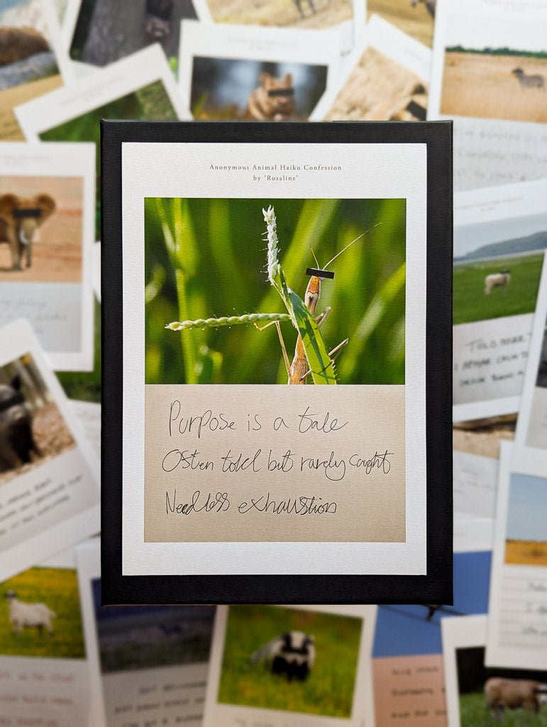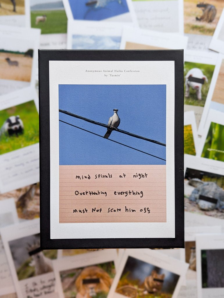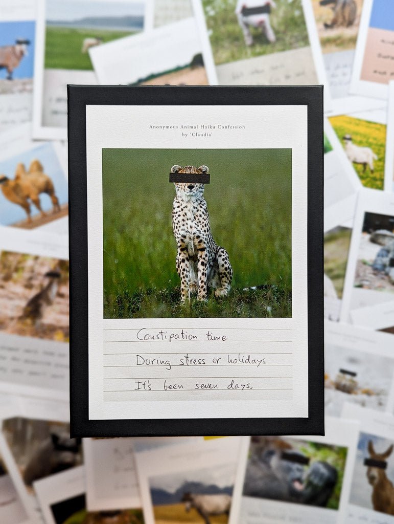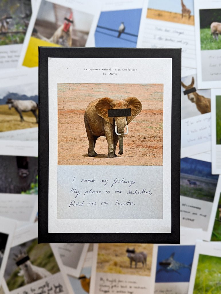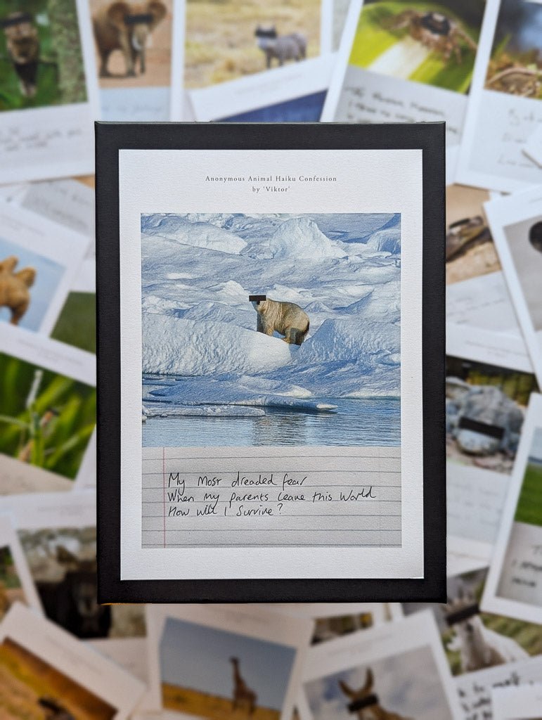A confession box containing 42 artworks from the Anonymous Animal Haiku Confessions series. Each artwork pairs a surreal animal photograph with censored eyes and an anonymous haiku confession.